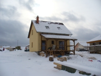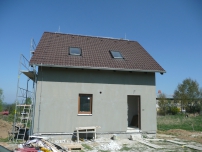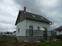 Na pom?rn? svait pozemek je d?m s obyvatelnm podkrovm a malou zastav?nou plochou velmi vhodnou volbou. Jedn se o typov d?m Ara v typovm vnit?nm uspo?dn, oproti typovmu nvhru pouze p?ibyl komn v obvacm pokoji, kde je plnovno umst?n krbovch kamen. Primrnm zdrojem tepla je elektrick kotel Protherm Rejnok 9K napojen na okruh st?ednho vytp?n s raditory, oh?ev tepl uitkov vody je ?een elektrickm bojlerem. St?echa domu m sklon 40, st?en krytina je KM Beta Elegant. Obvodov zdivo je Ytong tlou?ky 375 mm, vnit?n nosn zdivo Ytong 200 mm.